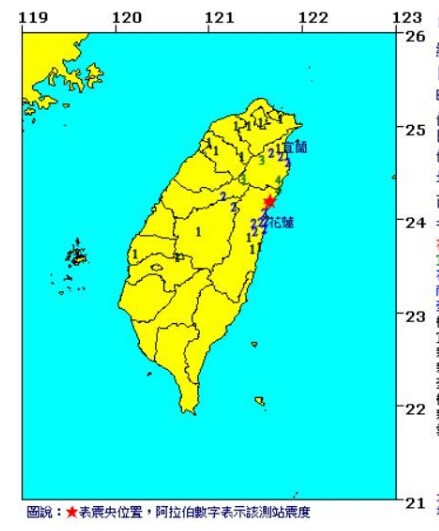 臺(tái)灣花蓮凌晨發(fā)生4.6級(jí)地震。(圖片來(lái)源:臺(tái)當(dāng)局“中央氣象局”)