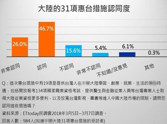 據(jù)悉,“東森新聞云”于2018年3月5日至3月7日透過網(wǎng)絡(luò)訪問調(diào)查,共計完成1,530份有效樣本。根據(jù)民調(diào)顯示,31項措施受到了臺灣網(wǎng)友高度關(guān)注(64.3%知道),68.5%網(wǎng)友認為可成功拉攏臺灣人心,74.7%的網(wǎng)友認為惠臺措施會爆發(fā)企業(yè)出走潮。