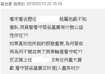 葉俊榮的一番話,也把臟水潑到了警察機關(guān)頭上。于是主管警務(wù)的“警政署署長”陳家欽也得出來。陳家欽稱,絕對沒有公器私用(一樣的套路,睜眼說瞎話,死不認賬),這樣的勤務(wù)是普遍性,沒有針對性。(為蔡父守墓是普遍性勤務(wù)?)也難怪網(wǎng)友會有這樣的回應(yīng):