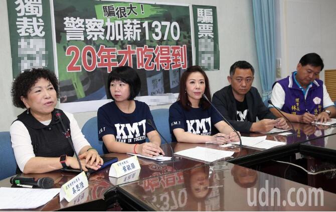 國(guó)民黨團(tuán)書記長(zhǎng)李彥秀(中)召開“警察加薪1370,20年才吃得到”記者會(huì)。(圖片來源:臺(tái)灣《聯(lián)合報(bào)》)