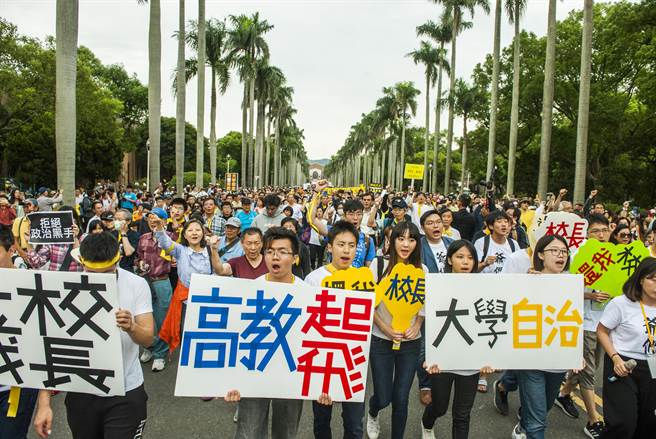 臺大師生4日在校園發(fā)起“新五四運動”,現(xiàn)場涌入數(shù)千名學(xué)生校友及聲援人士,高喊“大學(xué)自治、還我校長”等口號。(圖片來源:臺灣《中時電子報》)