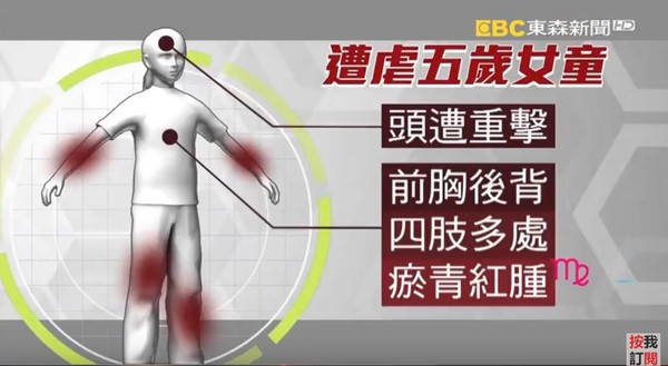 女童送醫(yī)后,傷勢(shì)相當(dāng)嚴(yán)峻,頭部疑似受到鈍器敲擊重創(chuàng),出現(xiàn)顱內(nèi)出血、頭蓋骨破裂、急性硬腦膜下腔出血、蜘蛛網(wǎng)膜腔出血等嚴(yán)重傷勢(shì);除了女童全身多處新舊瘀血、破皮、血腫外,更令院方感到震驚的是,女童疑似先前遭到異物強(qiáng)行插入,因此有肛裂情況,不排除女童有遭到性虐待的可能。
