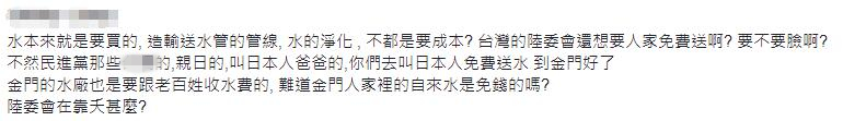 聽聞陸委會這番說辭,臺灣網(wǎng)友都忍不了了:“這件事本身是極度缺水的金門大大受惠,大陸以每噸小于臺灣島內(nèi)自己供水的收費(fèi)絕對是優(yōu)惠價(jià)格,絕非盈利項(xiàng)目。以收費(fèi)為由故意回避優(yōu)惠價(jià)格,陸委會操縱‘反中仇陸’民粹如潑婦罵街何時(shí)了?”“陸委會否認(rèn)是‘惠臺措施’,為什么金門不從臺灣引水?”