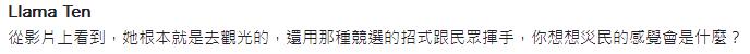 國民黨發(fā)言人洪孟楷在Facebook痛批這是“史上最傲慢勘災”,形容蔡英文像是“花車游行上的選美小姐”。還有民眾火大開嗆,“勘災?連下來泡在水里做做秀都不肯,搭云豹來就算了,裝一下沉痛、裝一下反省可以不可以?面帶微笑是哪招?還給我揮手!你是來謝票還是來掃街?你確定你沒有跑錯棚?”