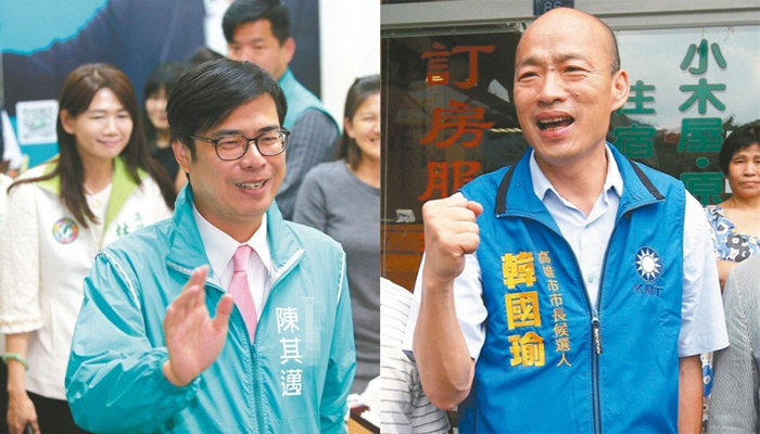 民進(jìn)黨高雄市長參選人陳其邁(左)、國民黨高雄市長參選人韓國瑜。(圖片來源:臺灣《聯(lián)合報(bào)》)