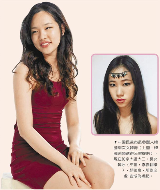 國(guó)民黨高雄市長(zhǎng)參選人韓國(guó)瑜次女韓青(右圖),現(xiàn)在加拿大讀大二。長(zhǎng)女韓冰(左圖),顏值高,所到之處皆成焦點(diǎn)。(圖片取自臺(tái)媒)
