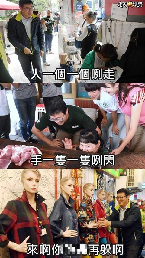 姚文智到城中市場和附近商圈拜票,看到整排賣衣服用的假人模特兒,玩性大發(fā)向它們一一握手致意。(圖片來自臺媒)