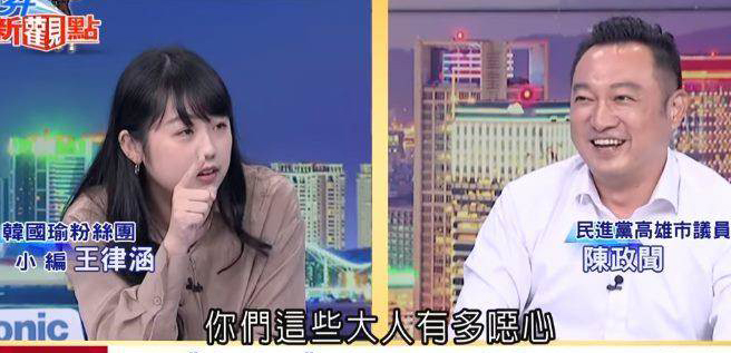爭(zhēng)論中,綠營(yíng)政客出言不遜,講出“年輕人可以做錯(cuò)事不能做壞事”;王律涵不甘示弱回嗆,“是你們這些大人才奇怪吧?我們長(zhǎng)大之后,才知道你們這些大人有多惡心”,讓綠營(yíng)政客聽了唯有尷尬強(qiáng)笑,而一旁的周玉蔻趕忙幫腔,“韓國(guó)瑜小弟你不要帶壞年輕人太可惜了”。