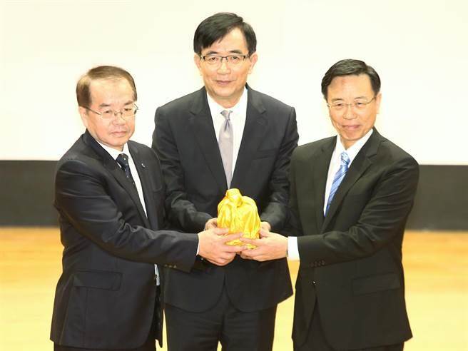 臺鐵局9日舉行局長交接典禮,卸任局長鹿?jié)嵣恚ㄗ笃穑┰谂_當局“交通部長”吳宏謀的監(jiān)交下,將局長印信交予新任局長張政源。(圖片來源:臺灣“中時電子報”)