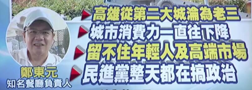 此外,在受訪(fǎng)時(shí)鄭東元還指出了高雄如今面臨的幾大問(wèn)題:從過(guò)去全臺(tái)第二大城淪為老三,城市整體消費(fèi)力持續(xù)下滑,留不住年輕人及高端市場(chǎng)……他直言,如今高雄的經(jīng)濟(jì)出現(xiàn)了嚴(yán)重問(wèn)題,而民進(jìn)黨卻整天忙著搞政治,根本不關(guān)注基層百姓的經(jīng)濟(jì)民生及招商引資,痛批“民進(jìn)黨只會(huì)拼政治,不會(huì)拼經(jīng)濟(jì)”!