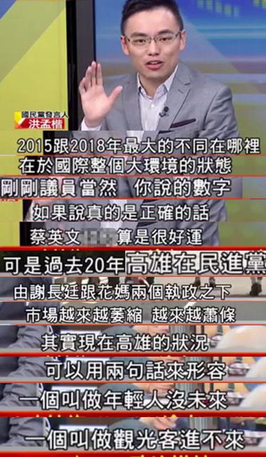 國(guó)民黨發(fā)言人洪孟楷先發(fā)制人的表示,如果議員給出的數(shù)字是正確的話(huà),那只能說(shuō)“蔡英文算是很好運(yùn)”,而事實(shí)是,高雄在民進(jìn)黨近20年的執(zhí)政下,現(xiàn)況用兩句話(huà)就能形容:1)年輕人沒(méi)未來(lái);2)觀光客進(jìn)不來(lái)。