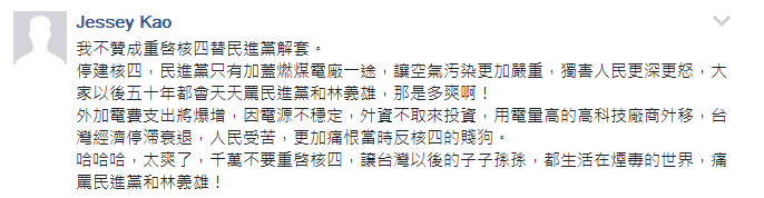 對(duì)此,有網(wǎng)友表示,民進(jìn)黨所謂的“綠色執(zhí)政,質(zhì)量保證”就是把百姓當(dāng)成白癡,等到海水褪去,才知道誰(shuí)沒穿褲子;還有人認(rèn)為,就不應(yīng)該重啟核四為民進(jìn)黨解套,讓他們繼續(xù)作,使民眾看清“綠營(yíng)”的嘴臉,“讓臺(tái)灣以后的子子孫孫都痛罵民進(jìn)黨。”