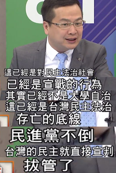 管中閔表示,臺當(dāng)局的權(quán)力或許可以阻礙學(xué)校的決定,但不能改變他們捍衛(wèi)大學(xué)自治與學(xué)術(shù)自由的決心;臺當(dāng)局或許可以恣意濫用權(quán)力于一時,但終將無法逃過人民和歷史的審判!在這個關(guān)鍵時刻,我將和臺大師生站在一起,面對威權(quán),絕不妥協(xié),堅(jiān)持保衛(wèi)臺灣大學(xué)九十年來的光榮傳統(tǒng)。我們必將贏回大學(xué)自治,臺灣大學(xué)也將因此屹立不搖!