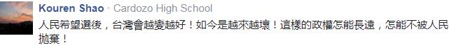 據(jù)臺(tái)灣《中時(shí)電子報(bào)》報(bào)道,有網(wǎng)友指出,他“有投蔡英文,結(jié)果似乎很快就后悔了”,原因在以下幾點(diǎn):首先,民進(jìn)黨不僅各種撕毀選前的反核承諾,還用破壞生態(tài)的方式大量搜刮土地來建風(fēng)力與太陽能電廠,而遇到全臺(tái)大停電時(shí),賴清德竟也對(duì)電價(jià)調(diào)漲不諱言;第二,對(duì)勞工的承諾也是“0項(xiàng)達(dá)成”;第三,對(duì)“同志議題”的退縮;第四,對(duì)外要大家團(tuán)結(jié)一致,但內(nèi)部卻用“臺(tái)灣價(jià)值”去試圖清算他人,但每個(gè)喊“臺(tái)灣價(jià)值”的人說出來的定義卻都完全不一樣;不僅如此,現(xiàn)在還要將黨政軍的手重新伸入大學(xué)迫害大學(xué)自治!