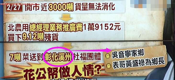 但可笑的是這筆所謂做公益的錢并不是從吳音寧自己腰包里掏出來的,而是動(dòng)用了“北農(nóng)總經(jīng)理室的業(yè)務(wù)推廣費(fèi)”;更有趣的是,國民黨臺(tái)北市議員王欣儀發(fā)現(xiàn),這9.12噸里有逾7成的蔬菜被送到了吳音寧的老家、其堂哥擔(dān)任鄉(xiāng)長的彰化溪州,于是不禁質(zhì)疑吳音寧是公器私用,“慷全民之慨做個(gè)人人情”。