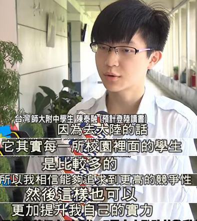 “除了一流大學(xué)外,不少學(xué)生還一口氣申請(qǐng)了5、6所大陸大學(xué)”,桃園市復(fù)旦高中校長(zhǎng)段臺(tái)民說,就算是大陸2、3線的大學(xué),學(xué)生也都會(huì)申請(qǐng),根本就是“吃了秤鉈鐵了心”的要到大陸念書;武陵校長(zhǎng)林清波也以校內(nèi)一名程度“優(yōu)秀”的學(xué)生為例,指就算已獲保送臺(tái)大資格,但這名學(xué)生仍決定考學(xué)測(cè)以申請(qǐng)北京大學(xué)元培學(xué)院,而該學(xué)生的哥哥去年就已到北京清華大學(xué)念書了。
