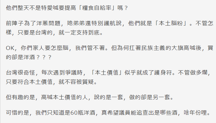 再來(lái)說(shuō)送禮的內(nèi)容,洋酒。以往蔡英文曾被爆料愛(ài)吃法國(guó)大餐,這回吳音寧送禮送洋酒算是對(duì)上了。只不過(guò)你吳音寧口口聲聲說(shuō)要支持本土農(nóng)產(chǎn)品,霸占道德高地,到頭來(lái)卻做起了洋酒“生意”,不覺(jué)得臉疼嗎?下面這位臺(tái)灣網(wǎng)友說(shuō)出了大部分人心里的感受: