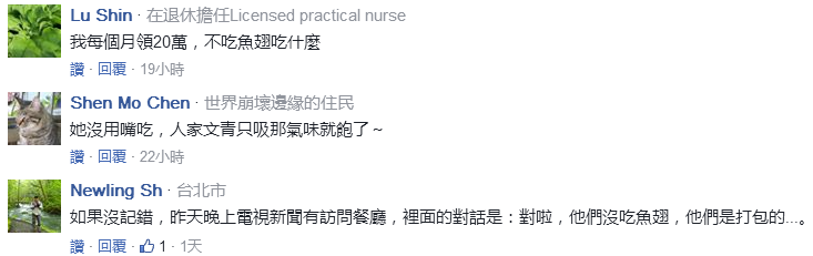 她表示,5月9日吳音寧還在臉譜網(wǎng)大談,北農(nóng)的基層有多么辛苦,所以為北農(nóng)加薪!5月11日,她就在高雄吃魚(yú)翅。蔡英文吃法國(guó)料理挨轟、李應(yīng)元吃魚(yú)翅道歉,比起他們的小老妹日子爽爽過(guò),其實(shí)還真冤枉了。