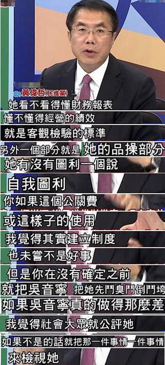 民進(jìn)黨民代黃偉哲也在政論節(jié)目中舌戰(zhàn)“懟吳團(tuán)”,不僅說吳音寧品操沒問題,從沒做過“自我圖利”的事兒,還指責(zé)外界明明沒有把所謂“公關(guān)費”的制度建好,卻還硬要先把吳音寧“斗臭斗倒斗垮”。