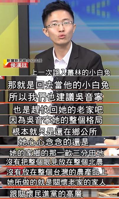 新黨新思維中心主任侯漢廷就說,既然是“誤入”那就哪兒來回哪兒去吧,反正吳音寧也沒有把心思放在北農(nóng)和臺灣的農(nóng)產(chǎn)品上;