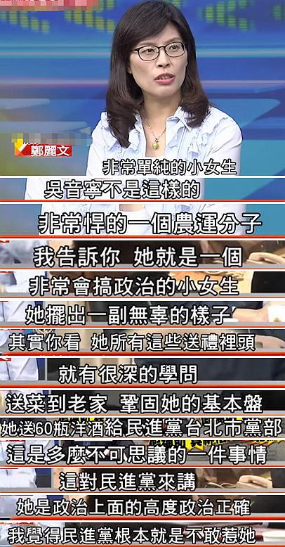 “行政院”前發(fā)言人鄭麗文則直言,吳音寧分明就“非常會搞政治”,并且因為她在民進(jìn)黨高層眼中是“政治上高度正確”,所以民進(jìn)黨團(tuán)里根本沒人敢惹她!