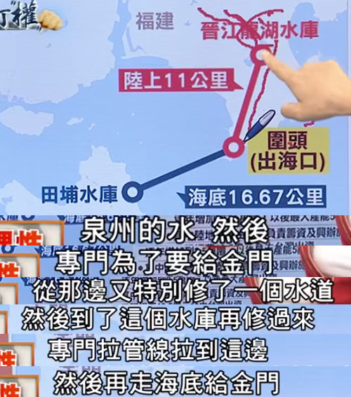 據(jù)悉,金門自福建引水,初步規(guī)劃時有福建晉江與廈門兩條路線,后經(jīng)雙方協(xié)商同意以福建晉江引水最優(yōu),晉江山美水庫庫容量6.55億立方米,當(dāng)時河道已打通到海邊圍頭,后期需要完成16.7千米的海上管線鋪設(shè),再通過登陸金門金沙鎮(zhèn)田埔海邊,鋪設(shè)300米陸上管線到田埔水庫,最后輸送到周邊的凈水場處理。那么問題來了,如此龐大的工程,耗費諸多的人力物力,難道不值得去辦一場慶典嗎?