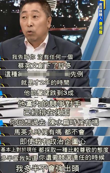 資深媒體人唐湘龍也表示,蔡英文執(zhí)政才2年,聲望就能跌倒3成一下,簡直“不可思議”!