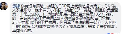 還有不少網(wǎng)友駁斥了王定宇的所謂臺(tái)當(dāng)局為金門通水出資了13.5億的說(shuō)法,直言“人家大陸出了19億呢,你怎么不講?”而對(duì)于“新馬買水”一事,有網(wǎng)友也表示“那是1961年簽的約了”,而且“買水”的條件跟金門根本不一樣好嗎?更有網(wǎng)友諷刺“福建的GDP馬上就要超過(guò)臺(tái)灣了,你以為人家跟你一樣小鼻子小眼缺金門那點(diǎn)錢”!