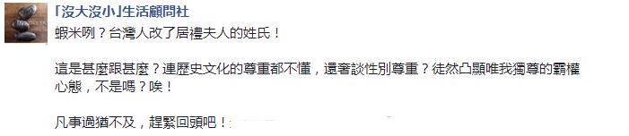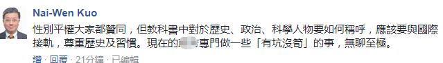 還有批評臺“教育部”根本就是“唯我獨尊的霸權心態(tài)”、“不尊重歷史文化,卻還奢談‘性別尊重’?”;