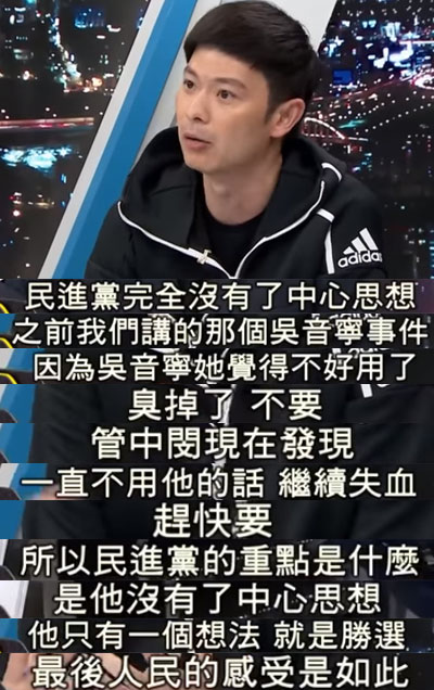 針對(duì)蔡英文當(dāng)局頻頻轉(zhuǎn)彎的做法,國民黨準(zhǔn)臺(tái)北市議員李柏毅甚至表示,民進(jìn)黨已經(jīng)失去了自己的“中心思想”,“看到吳音寧不好用,轉(zhuǎn)手丟掉;看到管中閔不用不行,就趕快要。這樣的民進(jìn)黨只有一個(gè)想法,那就是勝選,民眾的感受就是如此!