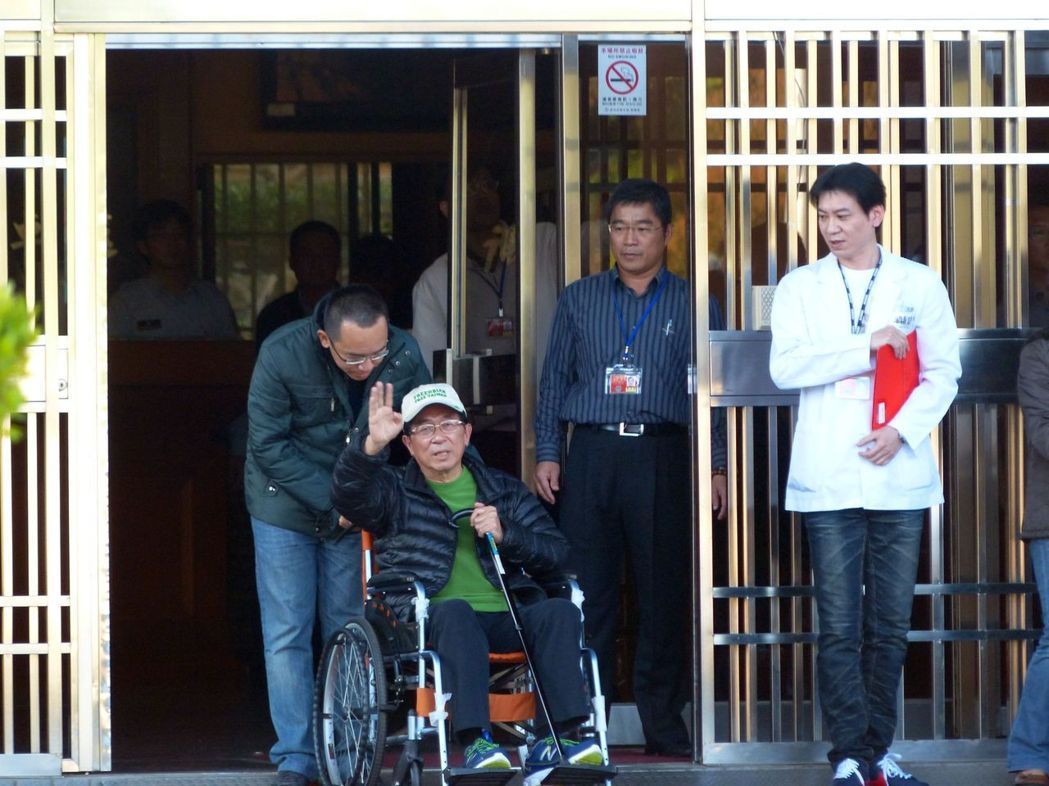 2015年陳水扁保外就醫(yī),在兒子陳致中陪同下離開(kāi)臺(tái)中監(jiān)獄。(圖片來(lái)源:臺(tái)灣《聯(lián)合報(bào)》)