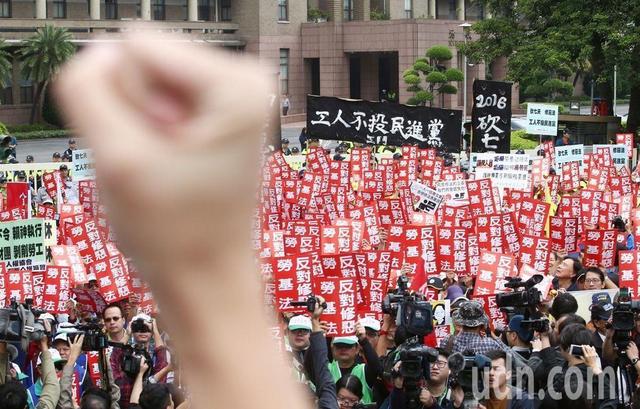 島內(nèi)勞團9日上午號召各工會數(shù)百人集結(jié)在臺當(dāng)局行政管理機構(gòu)前抗議。(圖片來源:臺灣《聯(lián)合報》)