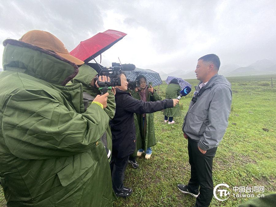 6月19日至23日,“說如意甘肅——海峽兩岸媒體人走進白牦牛故鄉(xiāng)”主題活動在甘肅舉辦。圖為記者們在天?h抓喜秀龍草原上采訪牧民。(中國臺灣網(wǎng)記者 李寧 攝)
