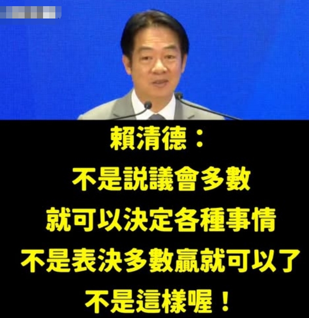 第三講中,賴清德更是重新定義了“民主”。他宣稱,“民主不是表決多數(shù)贏就可以”“不是議會多數(shù)就可以決定任何事情”,擺明在挑戰(zhàn)全臺:雖然藍(lán)白占多數(shù),但表決通過不算數(shù)。有網(wǎng)友替賴清德翻譯:只有他說的才算,這才是“真民主”。