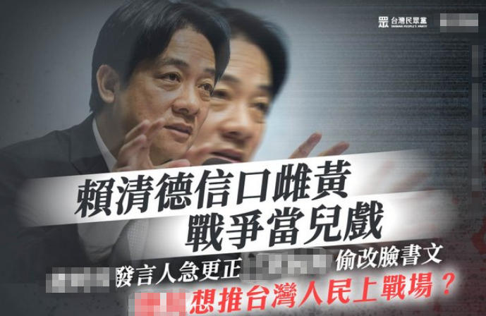 臺灣民眾黨批評賴清德推人民上戰(zhàn)場。(圖片取自網(wǎng)絡(luò))