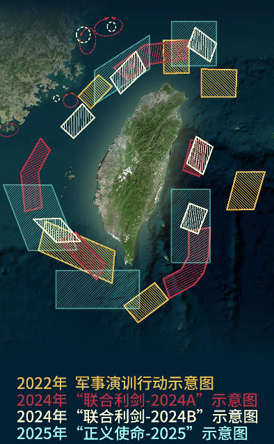 相比解放軍以往進行的“聯(lián)合利劍”“海峽雷霆”等演訓活動,“正義使命-2025”有何不同?從目前可見的各項信息中,至少可以觀察到三點變化。