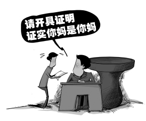 陳先生一家三口準(zhǔn)備出境旅游,需要明確一位親人為緊急聯(lián)絡(luò)人,于是他想到了自己的母親?蓡栴}來了:他需要提供他母親是他母親的書面證明。據(jù)了解,這樣的奇葩“證明”不在少數(shù)。很多人在辦事過程中遇到過類似令人啼笑皆非的證明:要證明你爸是你爸,要證明你沒犯過罪,要證明你沒結(jié)過婚,要證明你沒有要過孩子,要證明你沒買過房……(4月8日《人民日報》)