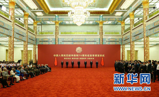 9月2日,中共中央總書記、國家主席、中央軍委主席習(xí)近平在北京人民大會堂向30名抗戰(zhàn)老戰(zhàn)士老同志、抗戰(zhàn)將領(lǐng)、為中國抗戰(zhàn)勝利作出貢獻(xiàn)的國際友人或其遺屬代表頒發(fā)中國人民抗日戰(zhàn)爭勝利70周年紀(jì)念章并發(fā)表重要講話。新華社記者龐興雷攝