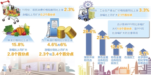 11月份,CPI漲幅比上月擴大0.2個百分點,同比漲幅連續(xù)3個月擴大。其中,食品價格同比上漲4.0%,漲幅擴大0.3個百分點;非食品價格上漲1.8%,漲幅擴大0.1個百分點。