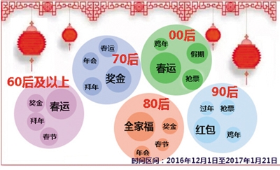 不同群體,對(duì)于“中國(guó)年”有著不同期盼。人民網(wǎng)輿情監(jiān)測(cè)室的數(shù)據(jù)統(tǒng)計(jì)顯示,00后、60后最關(guān)注春運(yùn)如何回家,90后最多的注意力在搶紅包,晉升為家庭主要支柱的80后們則更愿意攜帶一家老小通過(guò)全家福記錄下溫馨的春節(jié)時(shí)光,70后更關(guān)注一年辛苦得來(lái)的獎(jiǎng)金……這一組涵蓋各個(gè)年齡段人群的數(shù)據(jù),無(wú)疑是當(dāng)今中國(guó)的一個(gè)縮影,可以從中體會(huì)人群的流動(dòng)、代際的更替,更可以從中勾畫(huà)出千家萬(wàn)戶闔家團(tuán)聚、其樂(lè)融融的年景。