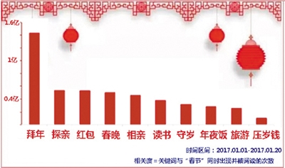 在微博空間,有關(guān)春節(jié)的何種話題互動(dòng)熱度較高?打開(kāi)客戶端,用戶傾向于瀏覽哪些題材的春節(jié)新聞?逛淘寶店鋪,哪些是成交量排名靠前的“年貨爆款”?“年年歲歲花相似,歲歲年年人不同”。雞年新春來(lái)臨之際,無(wú)論處身繁華的都市還是廣袤的鄉(xiāng)村,年的味道日漸濃厚。而來(lái)自網(wǎng)絡(luò)平臺(tái)的數(shù)據(jù),刻錄下人們注意力分配的狀況,讓人感受到中國(guó)人“變”與“不變”的春節(jié)溫情。
