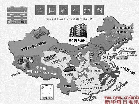 媒體記者基于調(diào)查而繪制的新版《全國(guó)彩禮地圖》,直觀地反映出全國(guó)彩禮分布情況的顯著特征——“西部高東部低,山村高城郊低”。在河南、山東、貴州、陜西、甘肅等地,更表現(xiàn)出“越是貧困地區(qū),越出現(xiàn)高價(jià)彩禮”的特點(diǎn)。從某種程度上說(shuō),彩禮地圖的高低分布,基本上契合了當(dāng)?shù)亟?jīng)濟(jì)發(fā)展水平,即彩禮金額的多少與當(dāng)?shù)鼐用袢司芍涫杖氪笾鲁史幢。結(jié)婚要不要收彩禮,要收多少彩禮,也與當(dāng)?shù)啬信壤姆植记闆r相關(guān),男女比例相差越懸殊,男多女少的局面越嚴(yán)重,“天價(jià)彩禮”之風(fēng)越惡劣。反之,如果男女比例相差不大,分布均衡,則彩禮現(xiàn)象也鮮有容身之地。