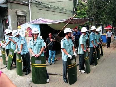 為拆除一違建窩棚,武漢洪山區(qū)組織城管隊(duì)員手持盾牌,將窩棚圍得水泄不通,希望用此“鐵桶陣執(zhí)法”困走釘子戶。雙方在僵持5分鐘后,達(dá)成協(xié)議。盤踞社區(qū)近半年的違章窩棚被拆除(6月29日《楚天都市報(bào)》)。