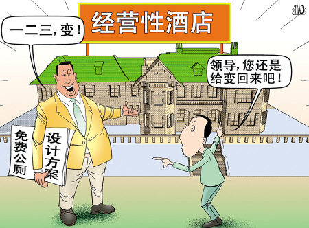 本來是要在綠化帶內(nèi)建一個集免費(fèi)公共廁所、修鑰匙店、提款機(jī)等多功能于一體的綜合性服務(wù)站,建好后非但沒有投入使用,竟然變身為“坤陽大酒店”,而記者在調(diào)查此事時又遭遇洛陽市園林局等四部門的相互“踢皮球”。(4月18日《東方今報(bào)》)