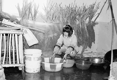 石林村村民楊梅芹用桶、盆接房頂漏下的雨水。