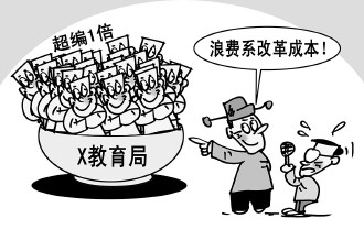 日前,湖北省武穴市教育局嚴重超編引起廣泛關注。記者實地調查發(fā)現,該局核定編制54人,實際在崗75人,還有40人“退二線”,基本不用上班,超編一倍左右。武穴市教育局局長王衛(wèi)平說:50歲的人退二線,的確是一種資源的浪費,“我當時就認為這也是改革的成本”(7月9日《京華時報》)!
