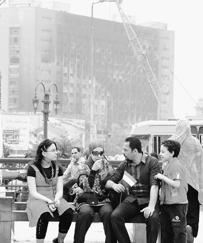 4月27日,一家埃及人在首都開(kāi)羅市中心的解放廣場(chǎng)上享受陽(yáng)光。在他們身后不遠(yuǎn)處,是位于尼羅河畔的已被燒毀的前執(zhí)政黨總部大樓。
