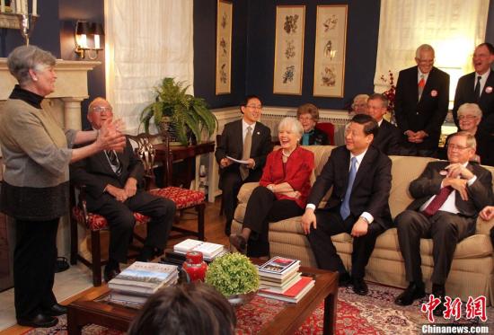 當(dāng)?shù)貢r(shí)間2月15日,中國(guó)國(guó)家副主席習(xí)近平到訪艾奧瓦州馬斯克廷市,并于27年前第一次訪問此地時(shí)結(jié)識(shí)的老朋友舉行茶敘。圖為習(xí)近平與老朋友敘舊場(chǎng)景。中新社發(fā)