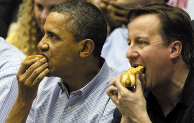 奧巴馬同卡梅倫在俄亥俄州觀看全美大學(xué)生籃球聯(lián)賽決賽,兩位領(lǐng)導(dǎo)人邊看比賽邊享用熱狗!