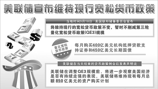 正當外界普遍預計本月起量化寬松政策將逐步收縮之際,美國聯(lián)邦儲備委員會9月18日在結(jié)束貨幣政策例會后宣布,將維持現(xiàn)行的寬松貨幣政策不變,暫時不削減第三輪量化寬松貨幣政策(QE3)規(guī)模。美聯(lián)儲稱,在削減資產(chǎn)購買步伐前,需看到更多的證據(jù)顯示經(jīng)濟和就業(yè)市場的改善是可持續(xù)的。